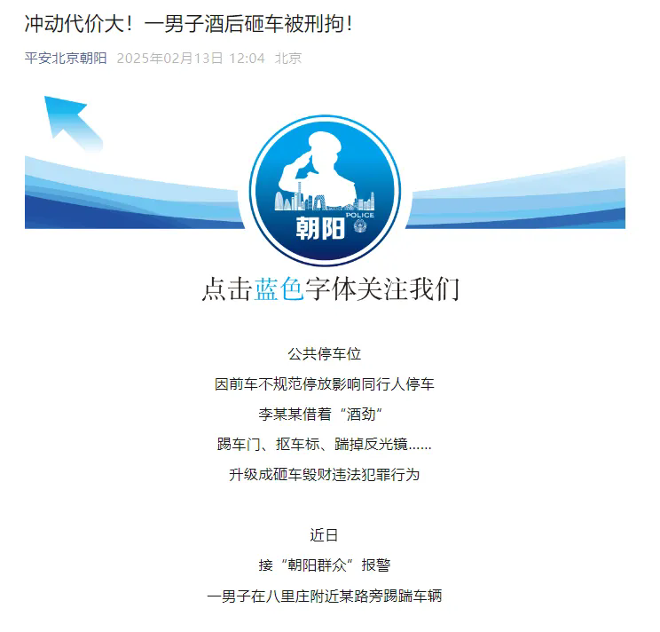 據“平安北京朝陽”微信公眾號發文,公共停車位因前車不規范停放影響同行人停車,演員李明德借著“酒勁”踢車門、摳車標、踹掉反光鏡……升級成砸車毀財違法犯罪行為。