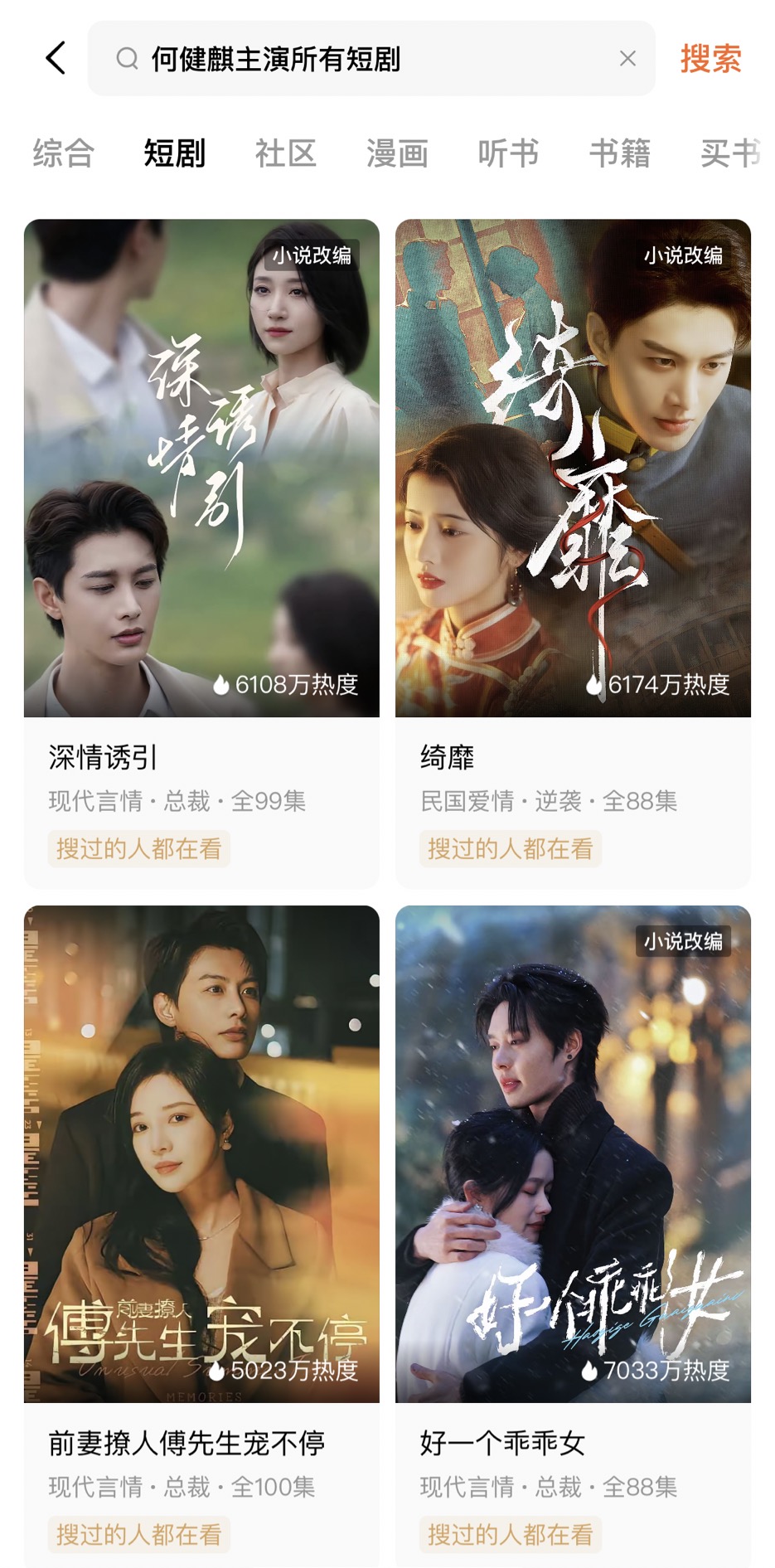 3月4日晚,短劇頂流何健麒被中國電視劇制作產業協會青年工作委員會(以下簡稱“青工委”)列入“微短劇劣跡演員”名單。大河報《看見》記者注意到,何健麒參演的作品仍能在