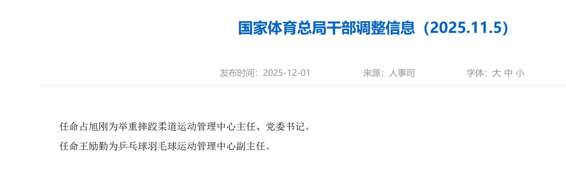 任命占旭剛為舉重摔跤柔道運動管理中心主任、黨委書記。任命王勵勤為乒乓球羽毛球運動管理中心副主任。