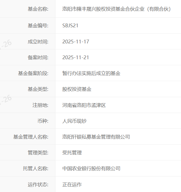 該基金注冊(cè)地位于洛陽(yáng)市孟津區(qū),規(guī)模3億元,洛陽(yáng)隆騰資本運(yùn)營(yíng)集團(tuán)直接持股90%,洛陽(yáng)國(guó)晟產(chǎn)業(yè)投資基金直接持股9.67%。洛陽(yáng)軒銀私募基金管理有限公司作為基金管理人,持股0.33%