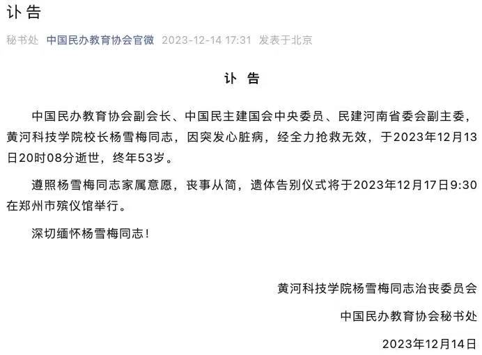 中國民辦教育協(xié)會副會長、中國民主建國會中央委員、民建河南省委會副主委,黃河科技學院校長楊雪梅同志,因突發(fā)心臟病,經(jīng)全力搶救無效,于2023年12月13日20時08分逝世,終年53