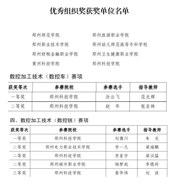 近日,鄭州市教育局公布了第八屆鄭州地方高校職業(yè)技能競賽結(jié)果的通知。鄭州科技學院榮獲優(yōu)秀組織單位獎,其中,實踐中心教師朱光、范光輝、張亞林、梁漢猛、劉波等指導的學