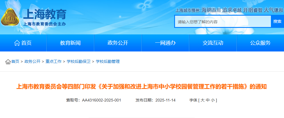 11月14日,上海市教育委員會等四部門印發《關于加強和改進上海市中小學校園餐管理工作的若干措施》,從建立健全管理制度、加強餐食質量保障、強化家長學生監督、提升監督管理效能四個方面,提出了十二項措施。
