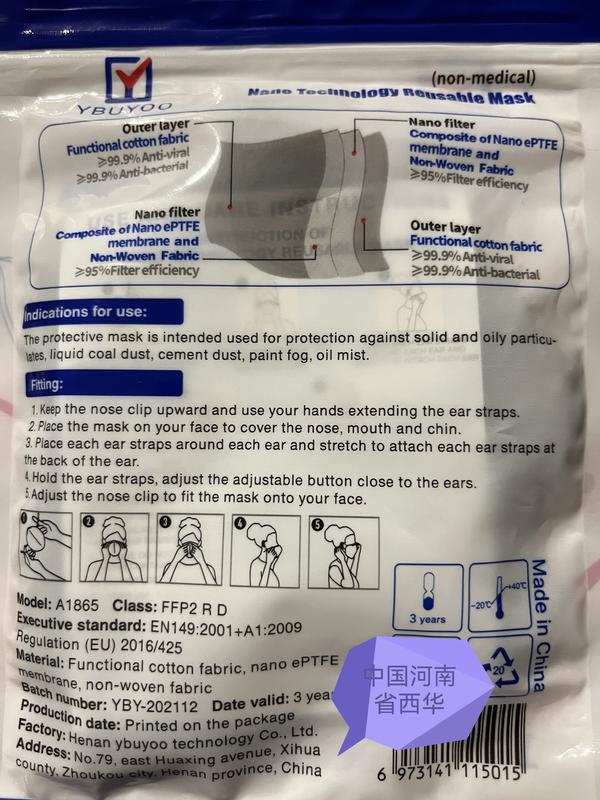每片出口海外的越布悠口罩均印有產(chǎn)地:中國河南省周口市西華縣華興大道東段79號