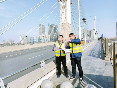 崔健(右)和同事巡查橋梁結構情況