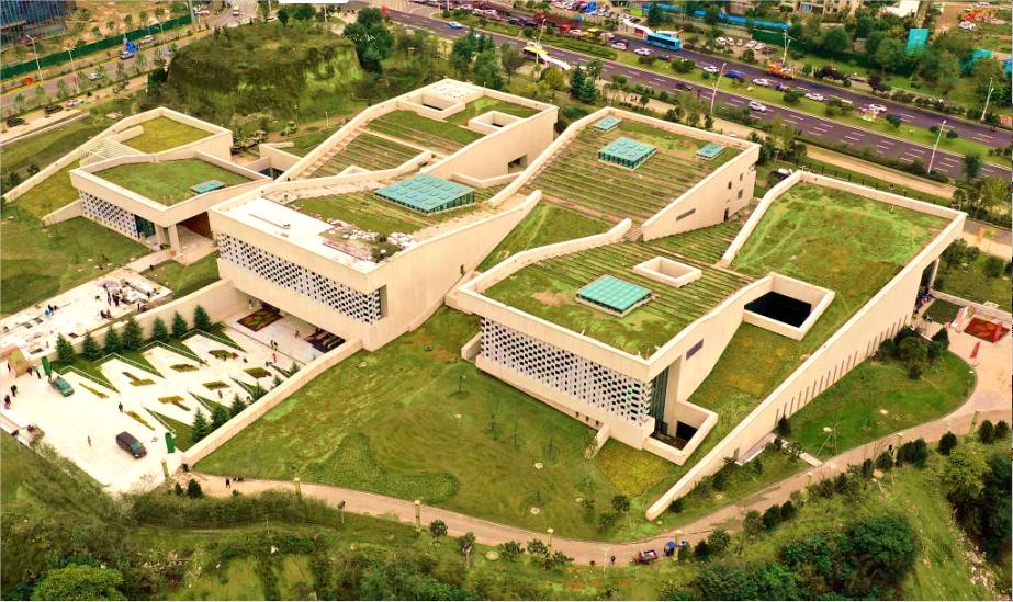 廟底溝仰韶文化博物館,位于河南省三門峽市廟底溝考古遺址公園內,西鄰迎賓大道,南鄰召公路,東北為廟底溝溝體,西南側有現存黃土臺塬遺跡,占地面積約95畝。廟底溝仰韶文化博物館建筑設計,以“交融”為設計構思出發點,將建筑體量南北分為7個楔形體塊,西高東低或東高西低交錯布局,如同交握的雙手,將公園綠地景觀和城市廣場融于一體。