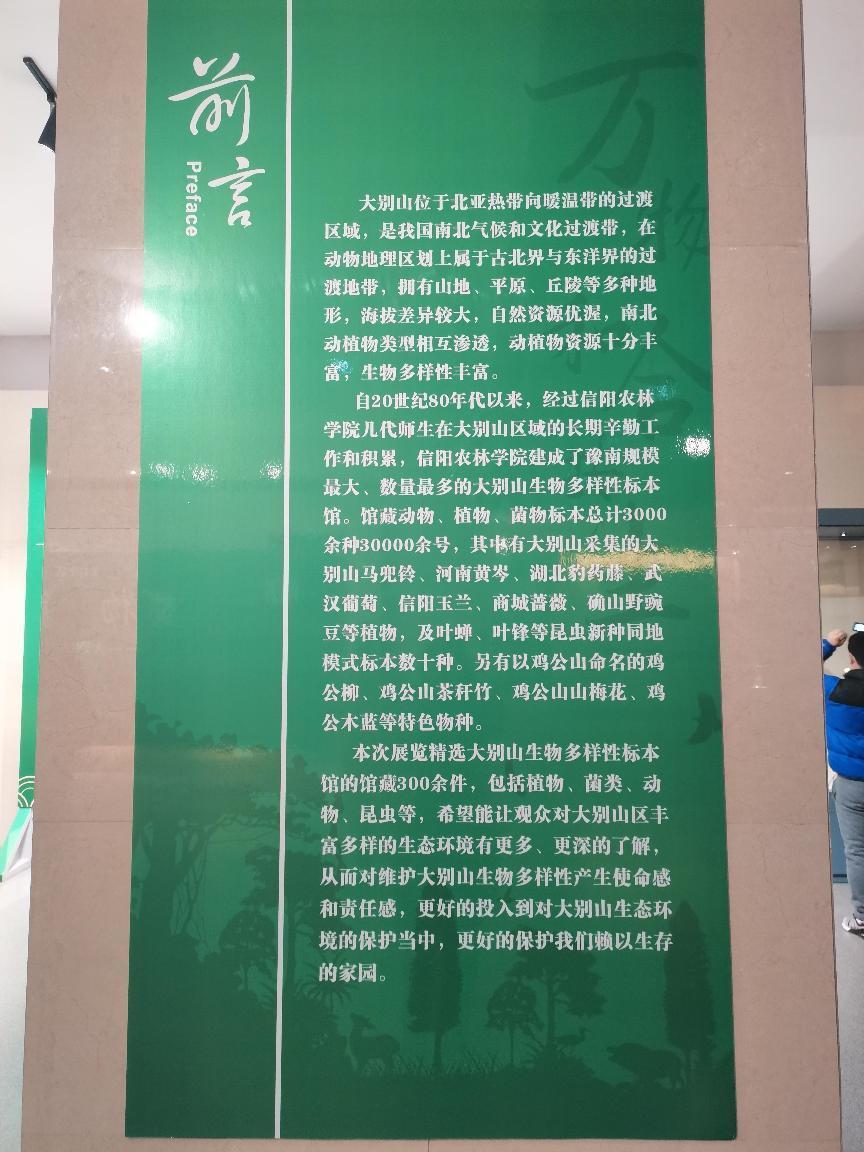 自20世紀60年代以來,經過信陽農林學院幾代師生在大別山區域的長期辛勤工作和積累,建成了豫南規模最大、數量最多的大別山生物多樣性標本館。本次展覽信陽博物館攜手信陽市生態環境局和信陽農林學院,精選大別山生物標本300余件,包括植物、菌類、動物、昆蟲等,希望能讓觀眾對大別山區豐富多樣的生態環境有更多、更深的了解,從而對維護大別山生物多樣性產生使命感和責任感,更好的投入到對大別山生態環境的保護當中,更好的保護我們賴以生存的家園。