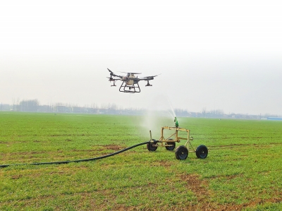 2月7日,蘭考縣紅廟鎮土嶺村,卷盤式噴灌機和無人機正在作業。卷盤式噴灌機代替人工,澆得勻實,效率高,一天可以作業30畝。無人機施肥一小時可以作業120畝。本報記者劉曉波攝