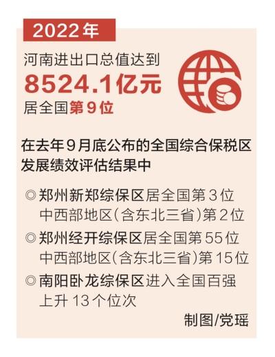 2022年,河南進出口總值在高基數上穩定增長,達到8524.1億元,居全國第9位。其中,鄭州新鄭、鄭州經開、南陽臥龍、洛陽四個綜保區對全省進出口總值的貢獻率超60%。