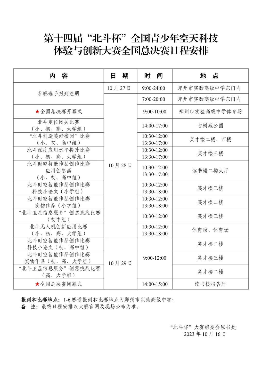 第十四屆“北斗杯”大賽全國總決賽將于10月27至29日在河南省鄭州市舉行。其中“北斗創造美好校園”比賽、“北斗深度應用水平提升比賽”、“北斗時空智能作品創作比賽”、“北斗衛星信息服務”創意挑戰比賽、“北斗無人機創新應用比賽”將在鄭州市實驗高級中學開展。“北斗定位闖關比賽”將在古樹苑公園舉行。具體活動安排情況如下: