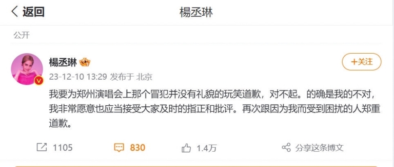 12月10日,楊丞琳通過社交媒體發(fā)表道歉聲明。據(jù)媒體報道,目前有多位市民向有關部門投訴,認為楊丞琳傷害了河南人的感情,要求對其進行處理。