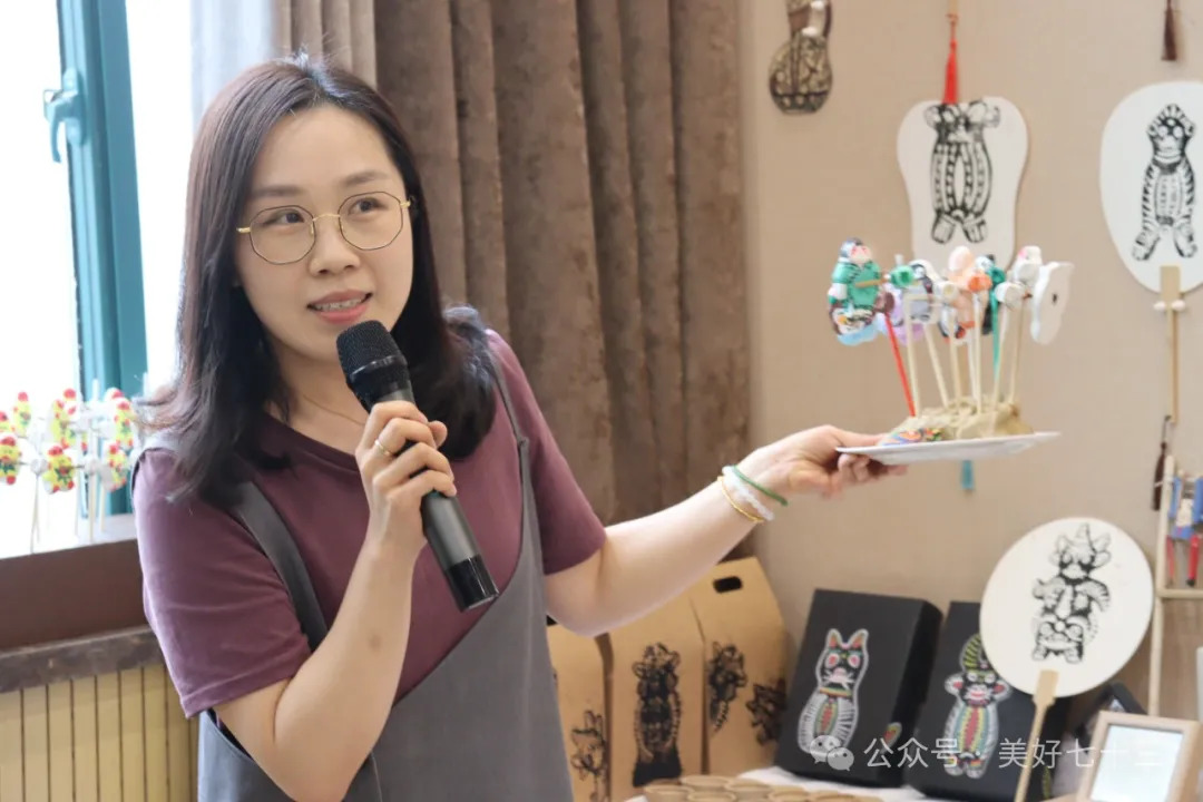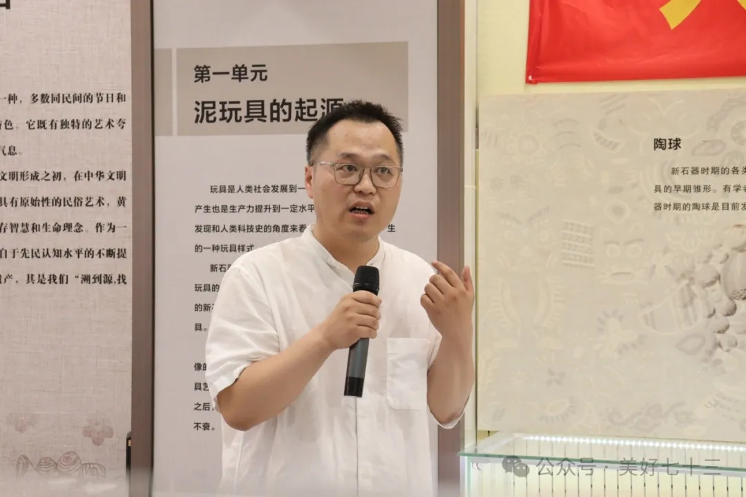 展覽分為靜態展示區、互動體驗區和影像展示區三大板塊,全方位展示了黃河流域泥玩具的歷史變遷、藝術特色及制作工藝。策展人孟俊峰博士親自導覽,生動講解,讓觀眾深入了解了泥玩具背后豐富的文化知識。此外,七十三中美術教師姚華蓉細致介紹了學校將非遺資源轉化為課程資源的實踐經驗,并展示了通過校本課程培養出的泥玩具創作新星,凸顯了學校在非遺美育上的創新與實踐。