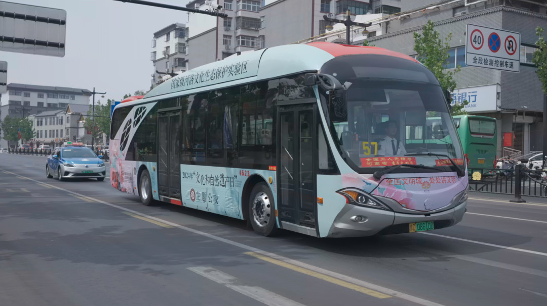 授牌儀式結束后,在洛邑古城南門廣場,非遺主題公交正式上線。據了解,此次主題公交選取運行線路長、經過景點多的9路、57路、81路,以公交車為載體,以河洛文化系統性建設成果為內容,打造專屬于河洛非遺的“流動展廳”。在主題公交車身外觀上,“國家級河洛文化生態保護實驗區”“人民的非遺人民共享”等標語十分醒目;公交內部,廣告欄、椅背、拉環扶手等處,均有非遺知識科普,拉環扶手上一面展示姚黃、島錦等10個牡丹品種,另一面則是我市河洛非遺新青年的代表們,掃描二維碼,即可觀看青年們參與非遺保護傳承背后的故事。