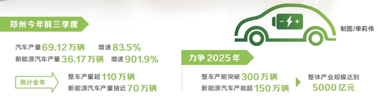 “今年前三季度,鄭州汽車產(chǎn)量69.12萬輛、增速83.5%,新能源汽車產(chǎn)量36.17萬輛、增速901.9%。預(yù)計(jì)全年整車產(chǎn)量超110萬輛,新能源汽車產(chǎn)量接近70萬輛。”鄭州市政府相關(guān)負(fù)責(zé)人表示,鄭州正在加快建設(shè)全國(guó)重要的新能源及智能網(wǎng)聯(lián)汽車研發(fā)和生產(chǎn)基地,力爭(zhēng)2025年整車產(chǎn)能突破300萬輛、新能源汽車產(chǎn)能超150萬輛,整體產(chǎn)業(yè)規(guī)模達(dá)到5000億元。