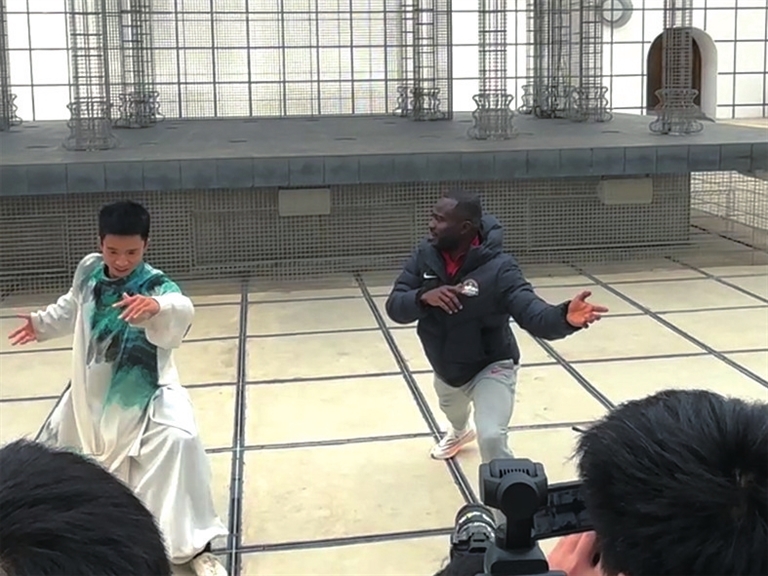 第一站,俱樂部在參觀完太極拳表演后,馬亞、卡多索、邁達納、阿奇姆彭四位外援一字排開,在老師身后“擺開架勢”,一輪太極拳打完,在首輪學習中“偷懶”的阿奇姆彭被留下加練一輪。表情銷魂的阿奇姆彭嘗試理解動作卻又不能完全領悟要領,本就具備“搞笑屬性”的阿奇姆彭點燃了全場的歡樂氛圍。