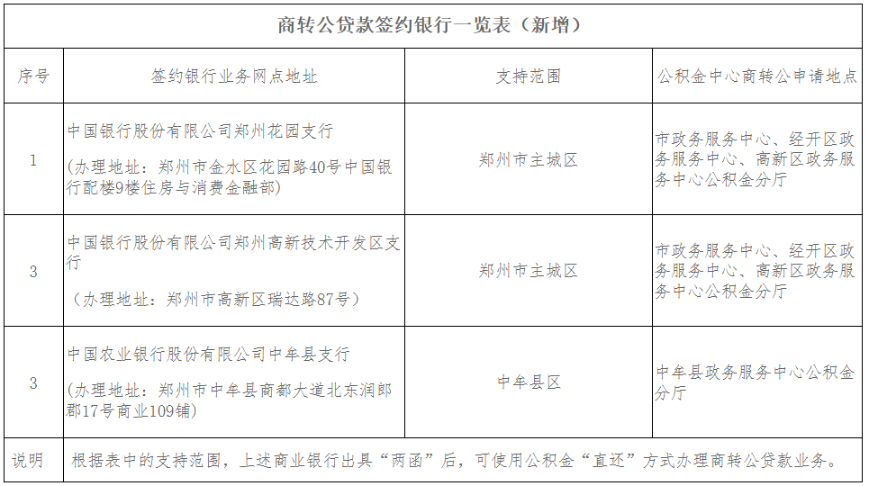 11月27日,鄭州住房公積金管理中心發布關于新增“商轉公貸款”簽約銀行的通知,中國銀行股份有限公司鄭州花園支行、中國銀行股份有限公司鄭州高新技術開發區支行、中國農